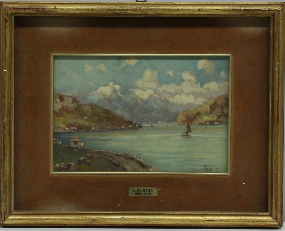 Ignoto "Paesaggio lacustre con barche a vela" olio su cartoncino (cm 17,5x26) firmato in basso a destra, in cornice
