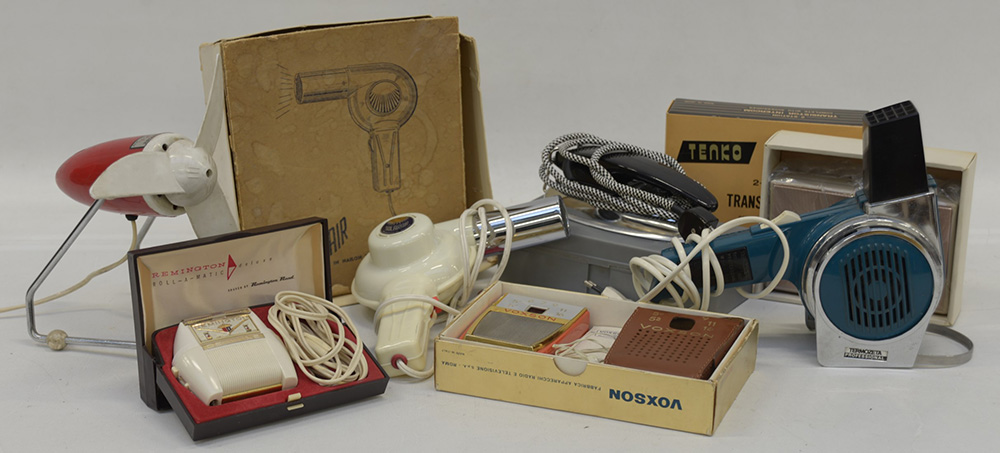 Lotto composto da due asciugacapelli, un piccolo ventilatore da tavolo, un ferro da stiro portatile, un rasoi elettrico, una radiolina e due casse portatili alcune in custodie originali, prima metà sec XX (difetti)