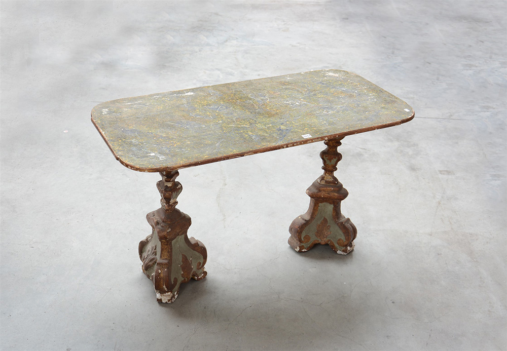 Tavolino in legno laccato con basi ricavate da candelieri (cm 90x54x45)