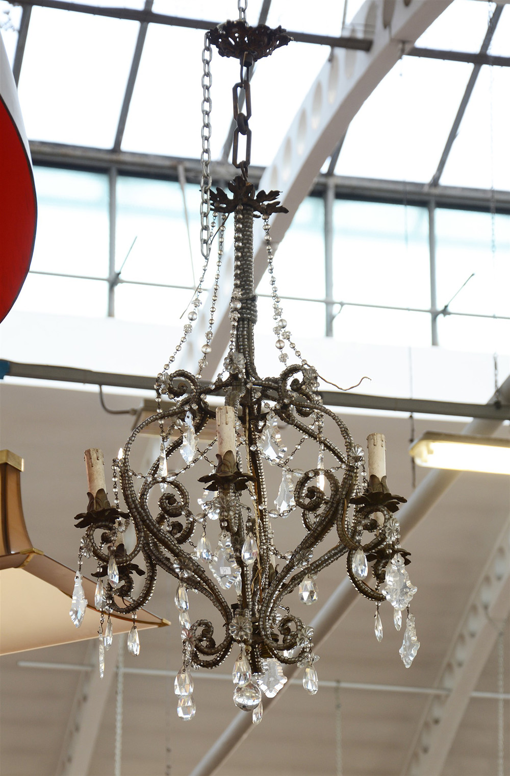 Lampadario a sette luci con struttura in ferro ricurvo decorato a perline e pendagli in cristallo sfaccettato (h cm 115) (difetti)