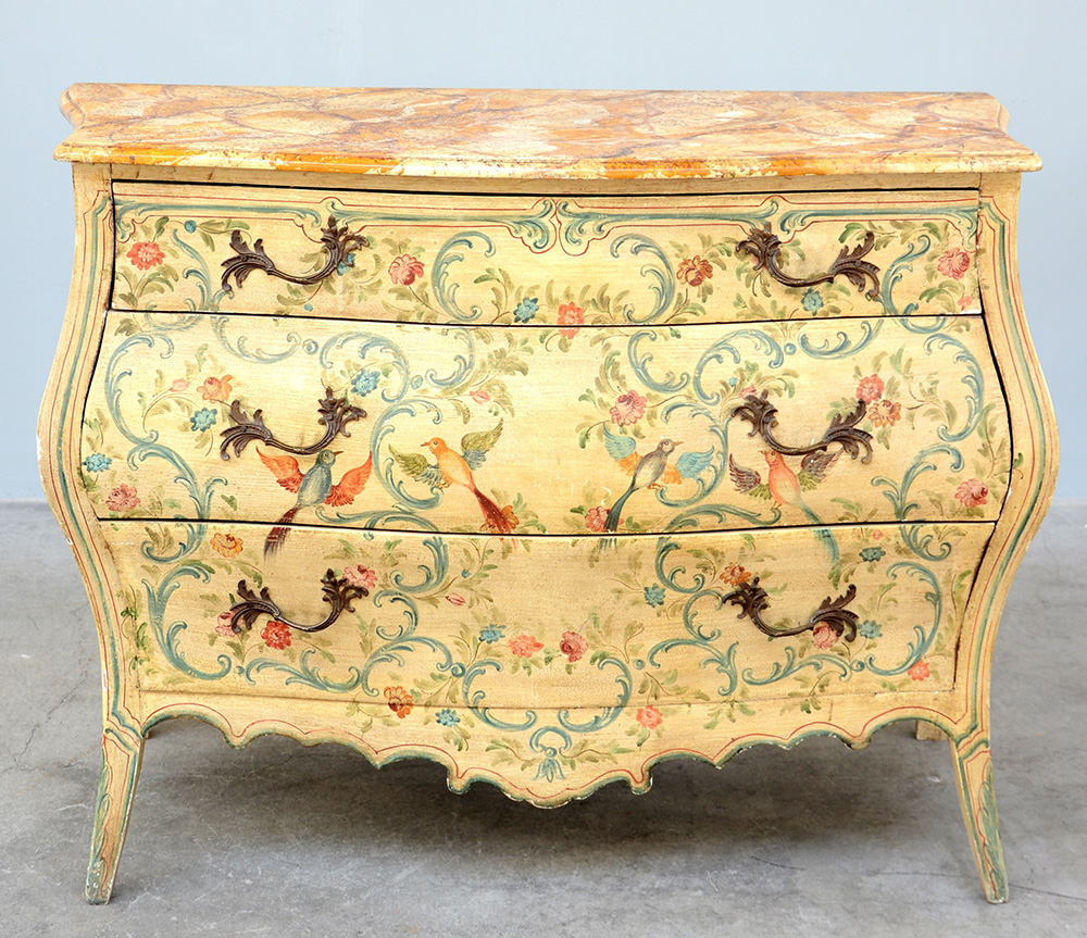 Comò bombato in stile Luigi XV a tre cassetti in legno dolce dipinto a fiori, volute e uccelli, piano non pertinente dipinto a finto marmo (cm 120x91x54) (difetti e restauri)