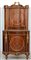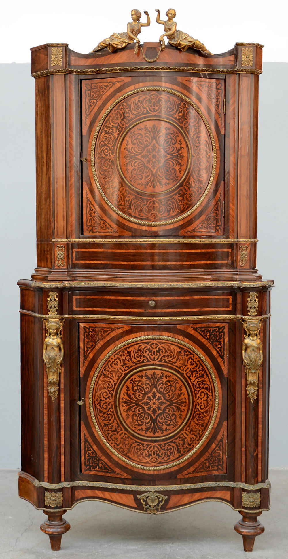 Angoliera Napoleone III a due corpi con fronte mossa a due sportelli ed un cassetto, lastronata ed intarsiata a motivi geometrici e floreali, guarnizioni e figure muliebri in bronzo dorato, piedi a trottola (cm 100x207x73 circa) (difetti e mancanze)