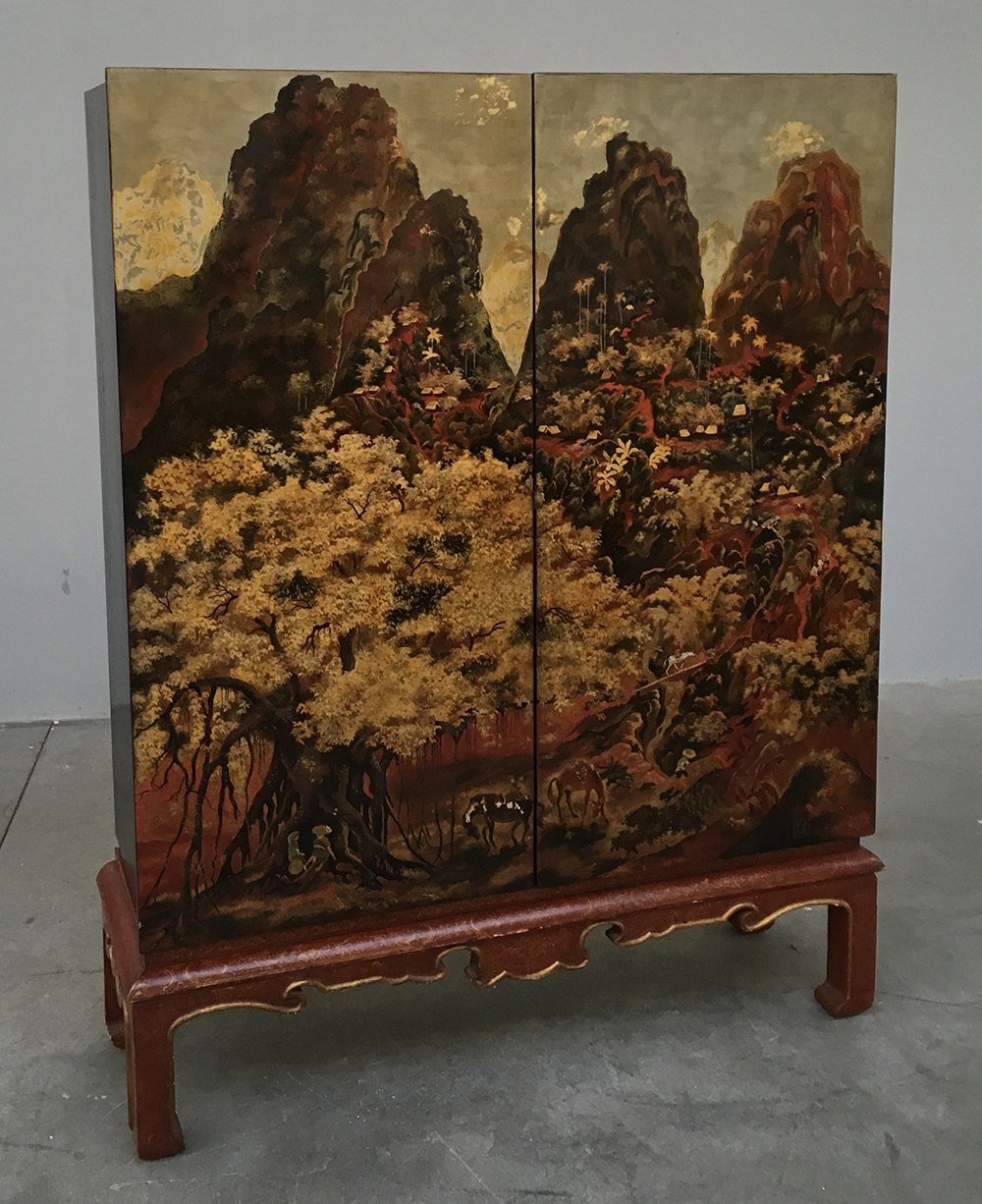 Mobile bar con decoro orientale a due battenti dipinti in policromia e raffiguranti un paesaggio (cm 122x158x40) (difetti)
