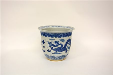 Manifattura Cina, portafiori in porcellana bianca e blu con drago e fenice. Cina sec. XX (d cm 36) (lievi difetti)