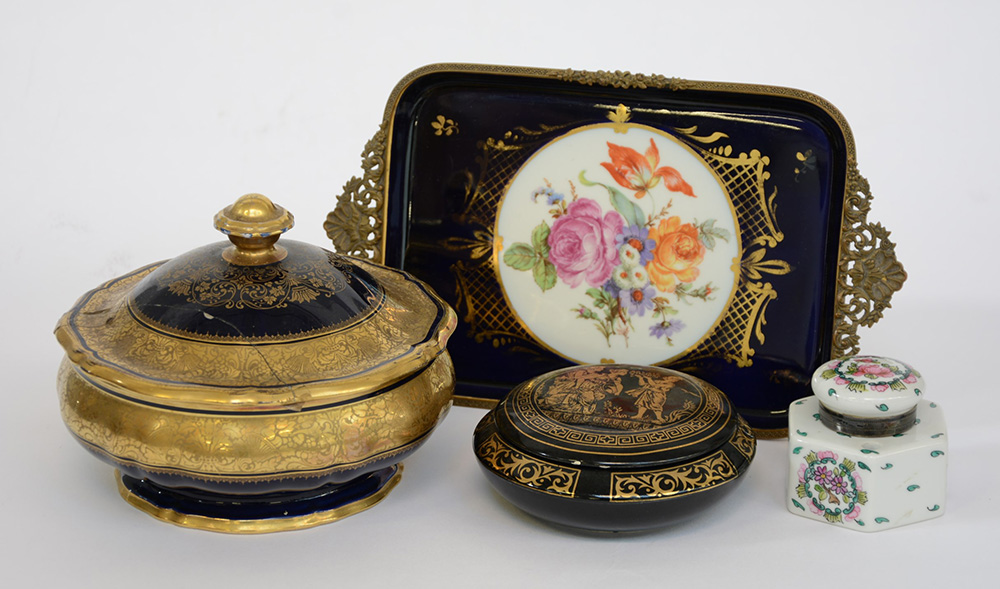 Lotto composto da un vassoietto limoges in porcellana con bordo in metallo, una biscottiera e due scatole in porcellana (difetti)