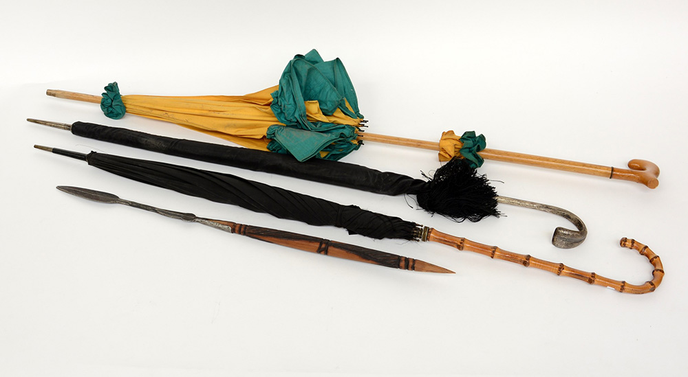 Lotto composto da tre ombrelli ed una lancia in stile africano (difetti)