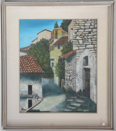 "Scorcio di paese" olio su tela (cm 58x47) firmato in basso a sinistra, in cornice (difetti)