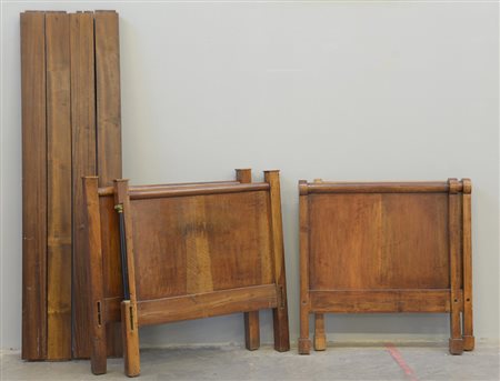 Coppia di letti Impero in noce decorati a mezze colonne ebanizzate con capitelli dorati. Sec. XIX (difetti)