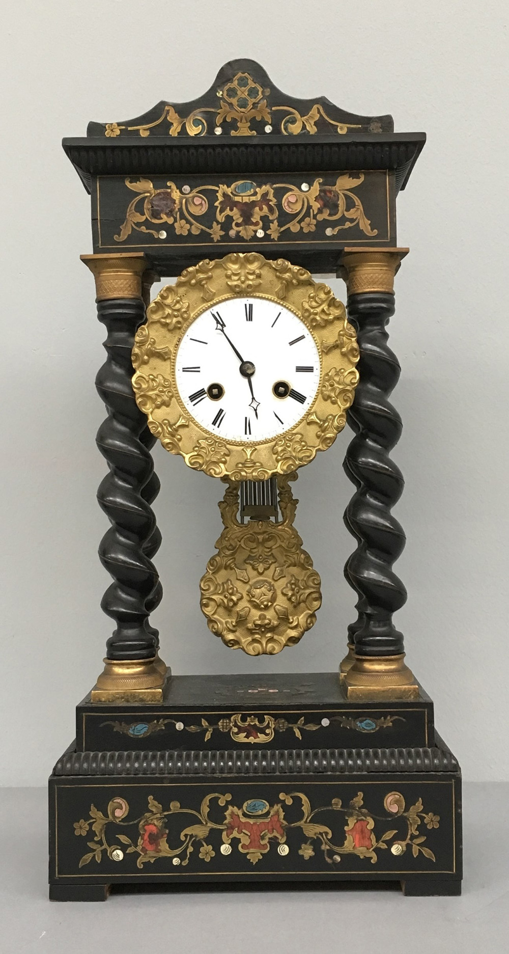 Pendola da tavolo con struttura a portico a con quattro colonne tortili, quadrante in smalto bianco con numeri romani, movimento con carica settimanale, suoneria delle ore e delle mezze su campanello (h cm 55,5)