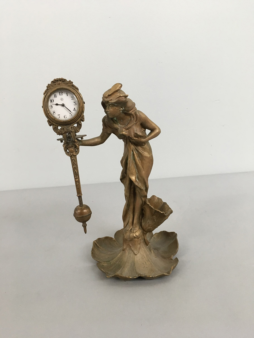 Orologio oscillante da tavolo Liberty in metallo con figura femminile, quadrante smalto bianco con numeri arabi, movimento con carica manuale (h cm 32,5)