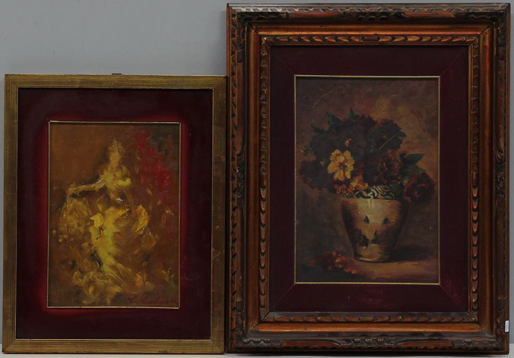 Lotto di due dipinti ad olio su tavola e cartone pressato raffiguranti una dama e un vaso con fiori, autori e misure differenti (lievi difetti)