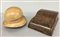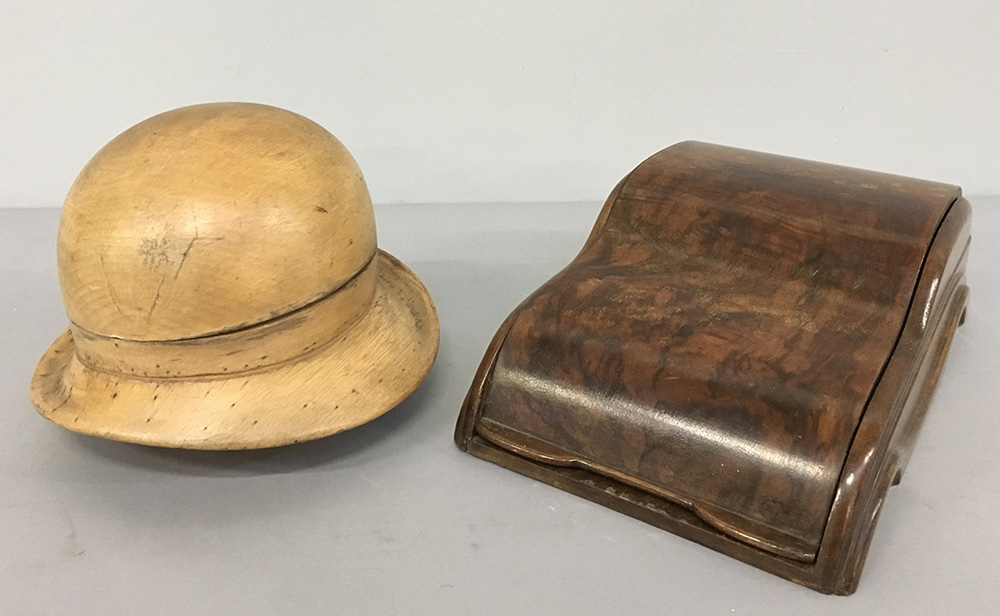 Lotto composto da una scatola in legno a sagoma di automobile ed una forma in legno di cappello per signora (lievi difetti)