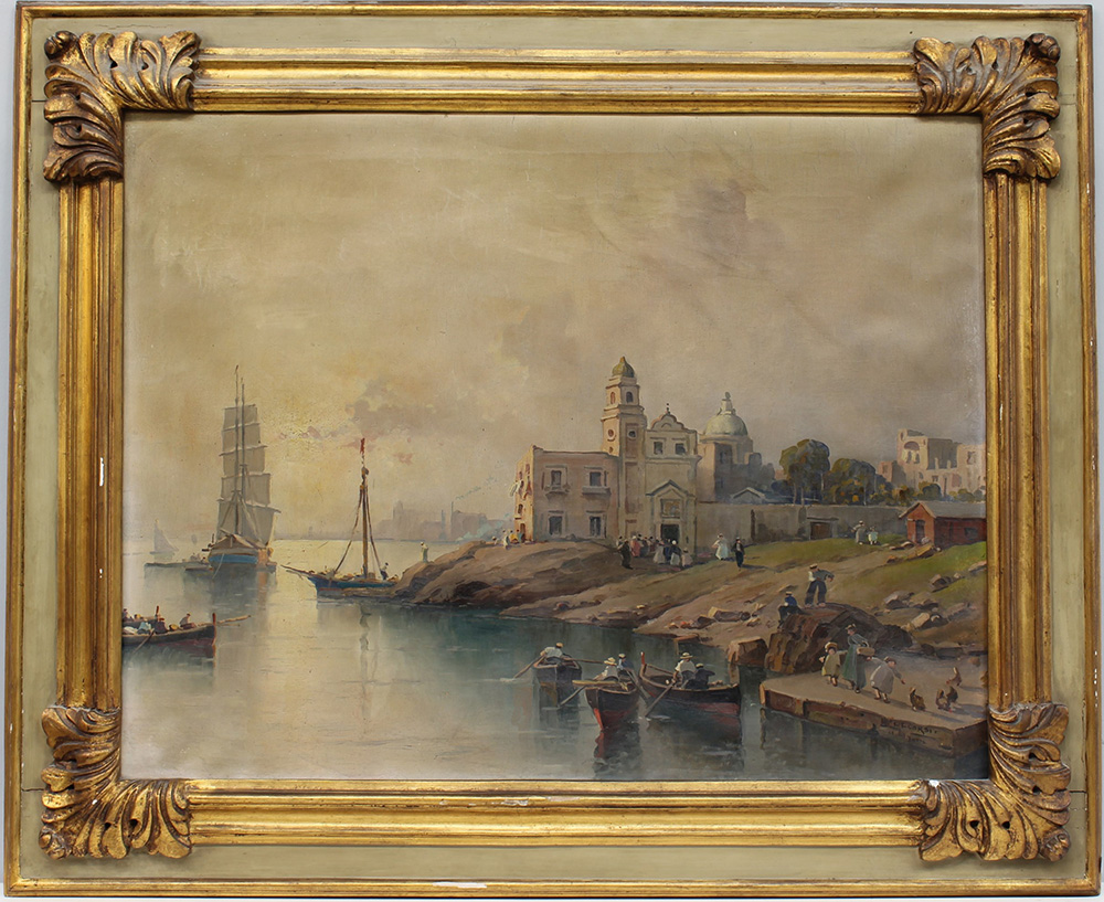 "Paesaggio costiero con barche" olio su tela (cm 70x90) firmato in basso a destra. Cornice intagliata, laccata e dorata (difetti)