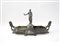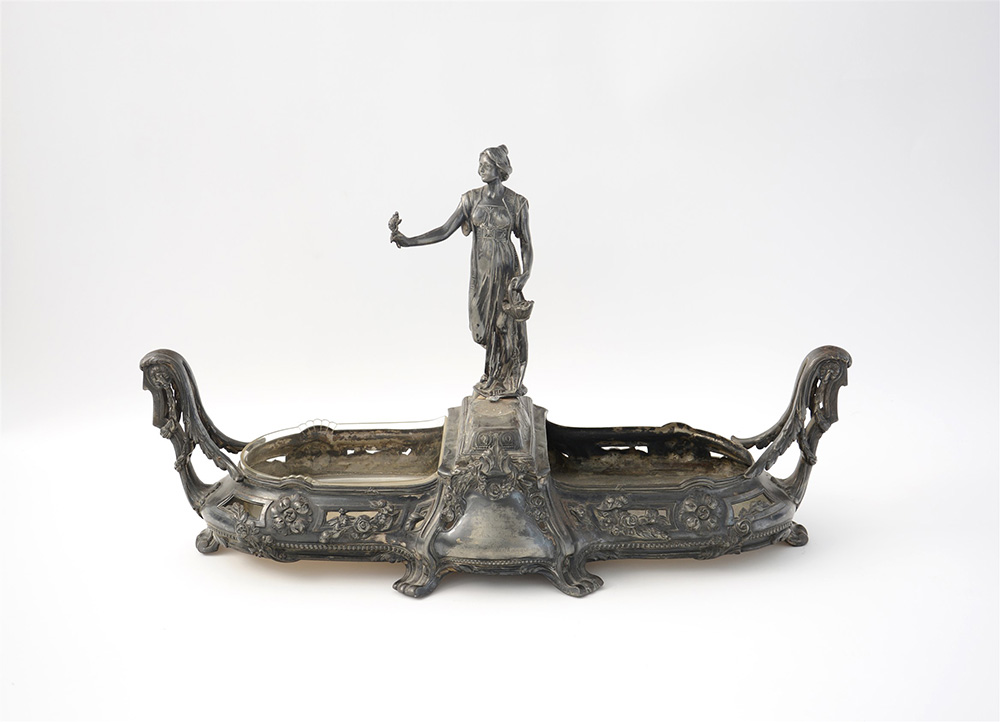 Centrotavola in peltro sbalzato decorato a fiori, volute e festoni, sormontato da una figura femminile e dotato di due vasche laterali, di cui solo una completa di contenitore in vetro; dedica incisa nella parte centrale datata maggio 1910 (cm 69x40x23) (difetti e mancanze)