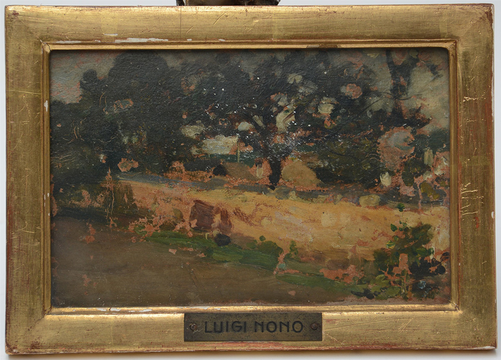 Ignoto sec. XIX "Paesaggio" olio su tavoletta (cm 12x18,5) iscritto al verso, in cornice