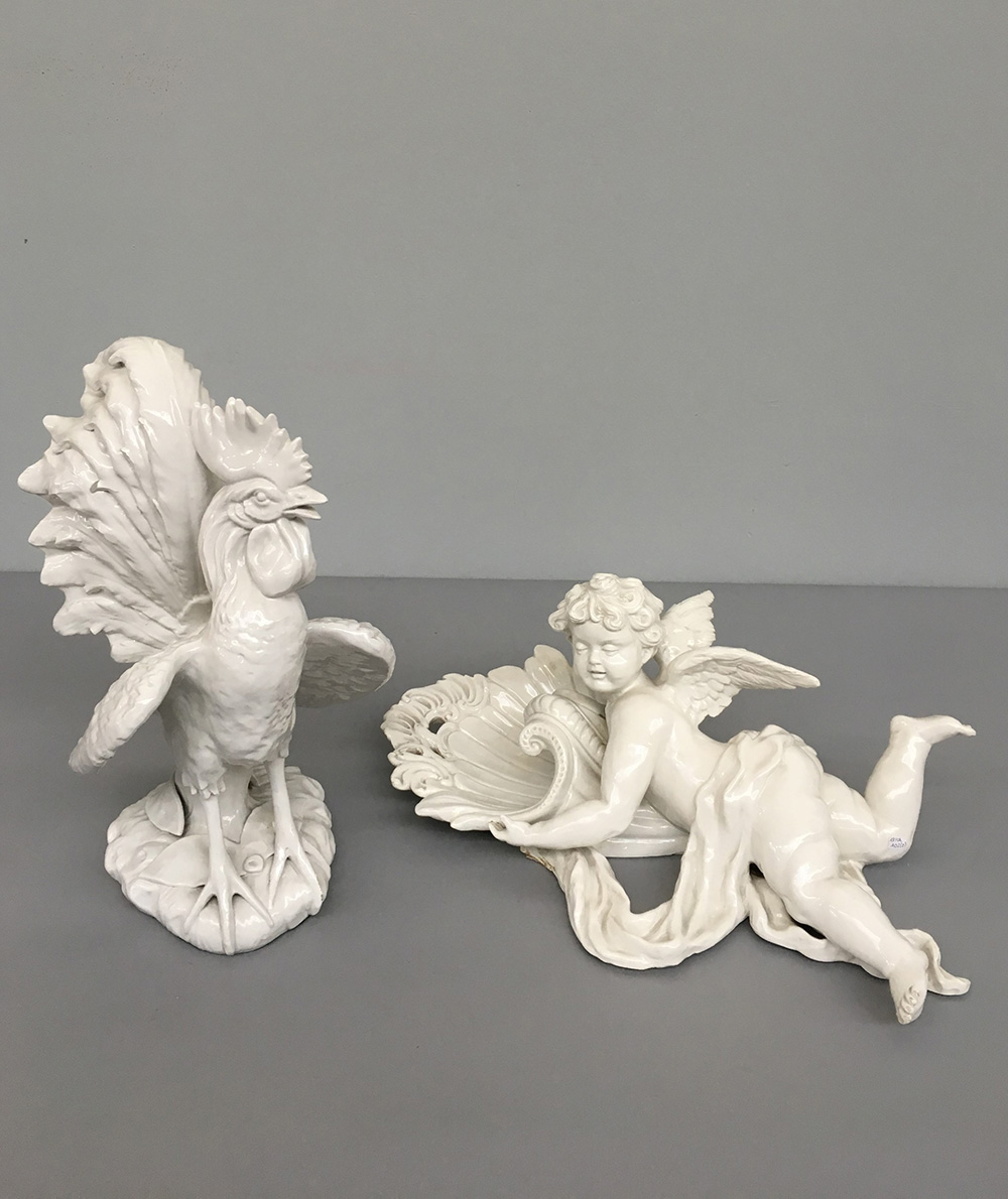 Lotto di due gruppi in ceramica bianca raffiguranti un gallo e un putto con conchiglia (difetti)