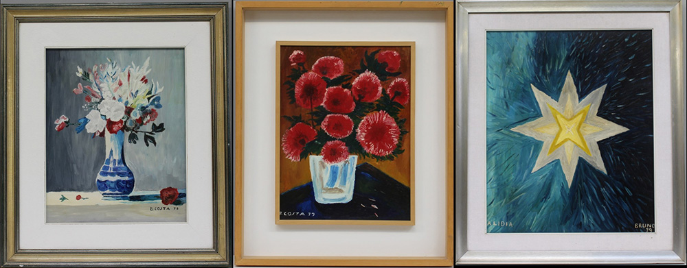 B. Costa Lotto di tre dipinti ad olio su tela raffiguranti una stella e vasi...