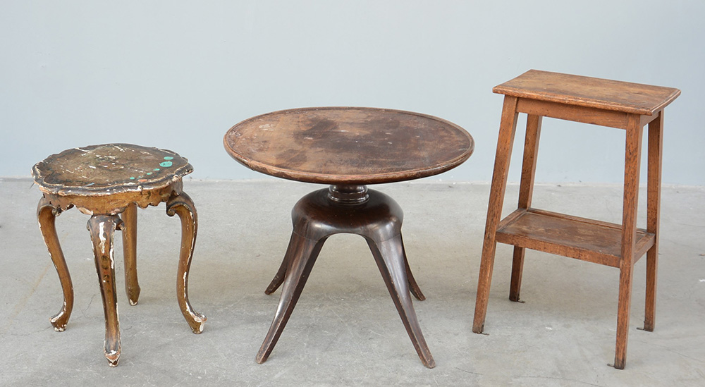 Lotto composto da due tavolini tondi di cui uno con piano polilobato e un tavolino rettangolare a due ripiani (difetti e mancanze)