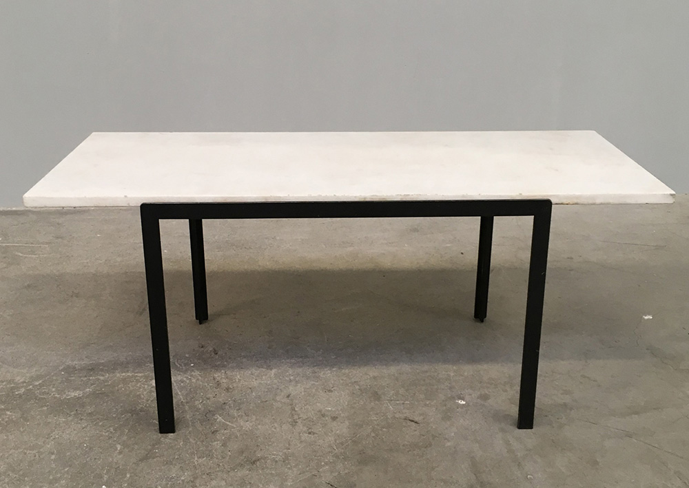 Tavolino basso con struttura in ferro smaltato nero e piano in marmo bianco, anni '60 del sec. XX (cm 110x46x45) (difetti)