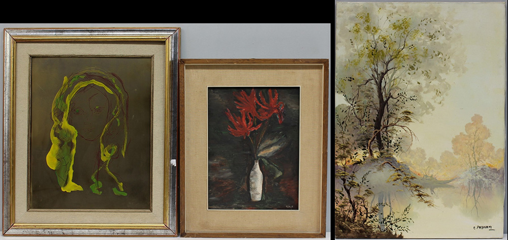 Lotto composto da un dipinto raffigurante vaso fiorito, uno raffigurante volto ed uno un paesaggio (difetti)
