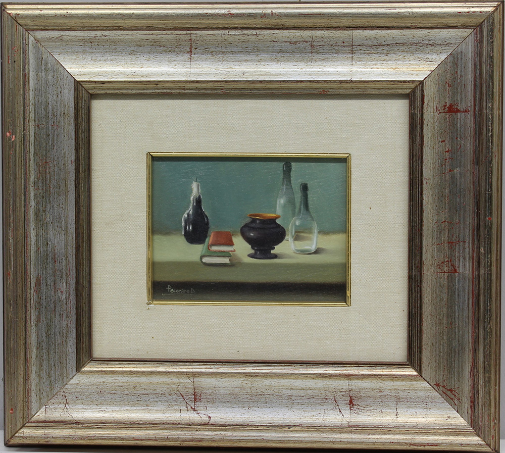 "Natura morta con libri, vaso e bottiglie" olio su tela montata su tavoletta (cm 15,5x20) firmato in basso a sinistra, in cornice