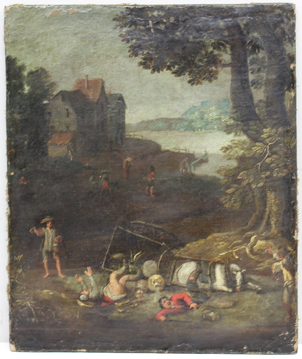 Scuola fiamminga del sec. XVII "L'incidente" olio su tela (cm 50,5x42) (difetti e restauri)