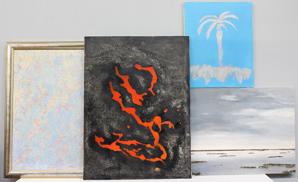 Lotto di quattro composizioni su tela di autori e misure differenti, di cui una in cornice (difetti)