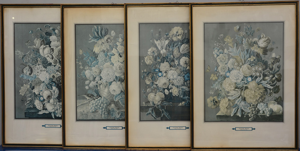 Gruppo di quattro riproduzioni da Joseph Nigg raffiguranti fiori (cm 69x49) (difetti)