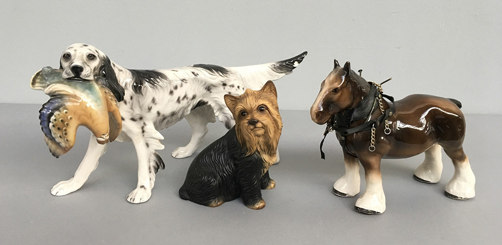Lotto di tre sculture in ceramica smaltata raffiguranti animali (difetti)