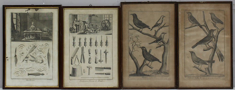 Lotto composto da quattro tavole tratte probabilmente dall’opera "Encyclopedie", di due diverse edizioni, due a soggetto arti e mestieri e due di soggetto ornitologico (difetti). Misure diverse in cornici (difetti).