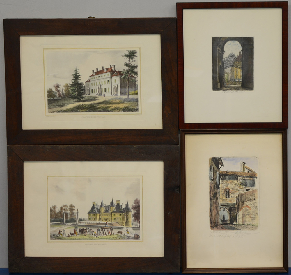 Gruppo di quattro incisioni a colori raffiguranti paesaggi, autori e...