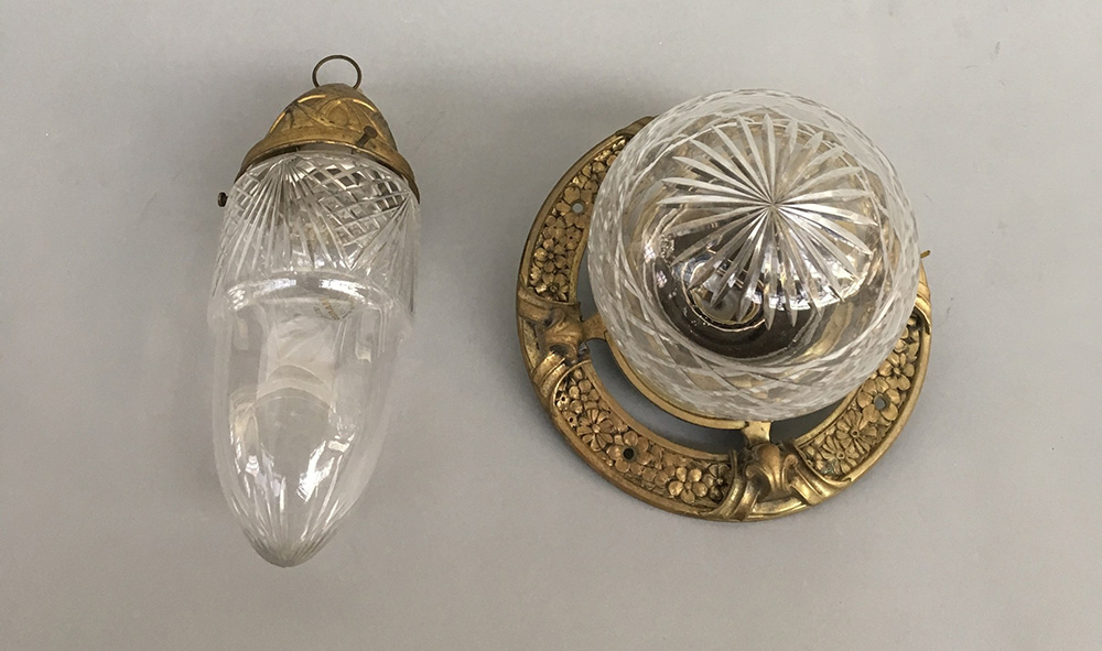 Lotto di due lampade da parete a una luce con strutture in metallo a decoro geometrico e floreale e paralumi in vetro, prima metà del secolo XX (difetti)