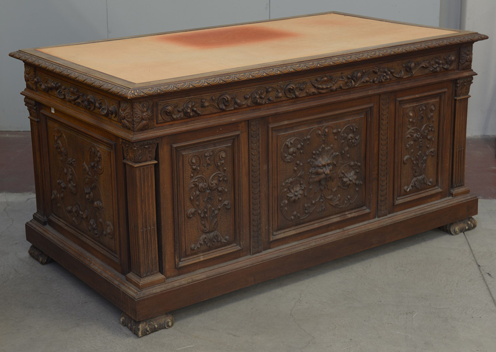 Scrivania in legno riccamente intagliato in stile rinascimentale, tre cassetti in linea sottopiano e sei suoi fianchi (cm 160x80x90) (difetti)