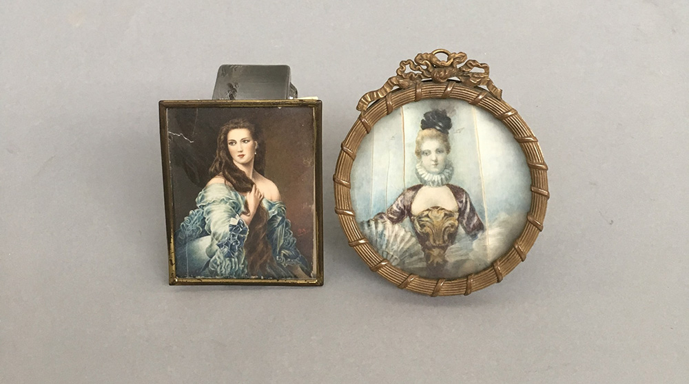 Lotto di due miniature dipinte su avorio raffiguranti gentildonne, autori, epoche e misure differenti, cornici in metallo (difetti)