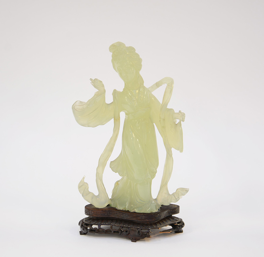 Scultura in pietra dura raffigurante dama dalle lunghe vesti con ventaglio, con base in legno (difetti e mancanze)