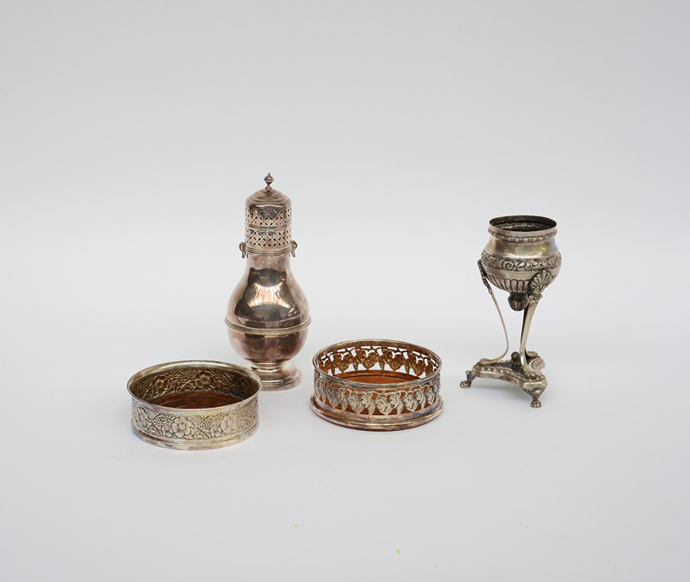 Lotto composto da uno spargi zucchero (h. max cxm 20) e un piccolo brucia profumo in argento (gr 440), e due sottobottiglie (difetti)