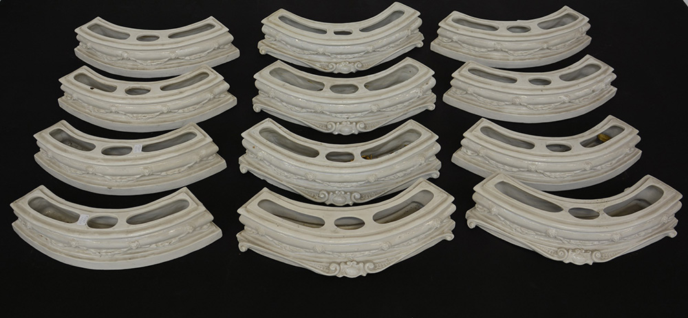 Manifattura del sec. XIX, centrotavola composto da dodici pezzi di porcellana bianca decorata a festoni in rilievo (difetti)