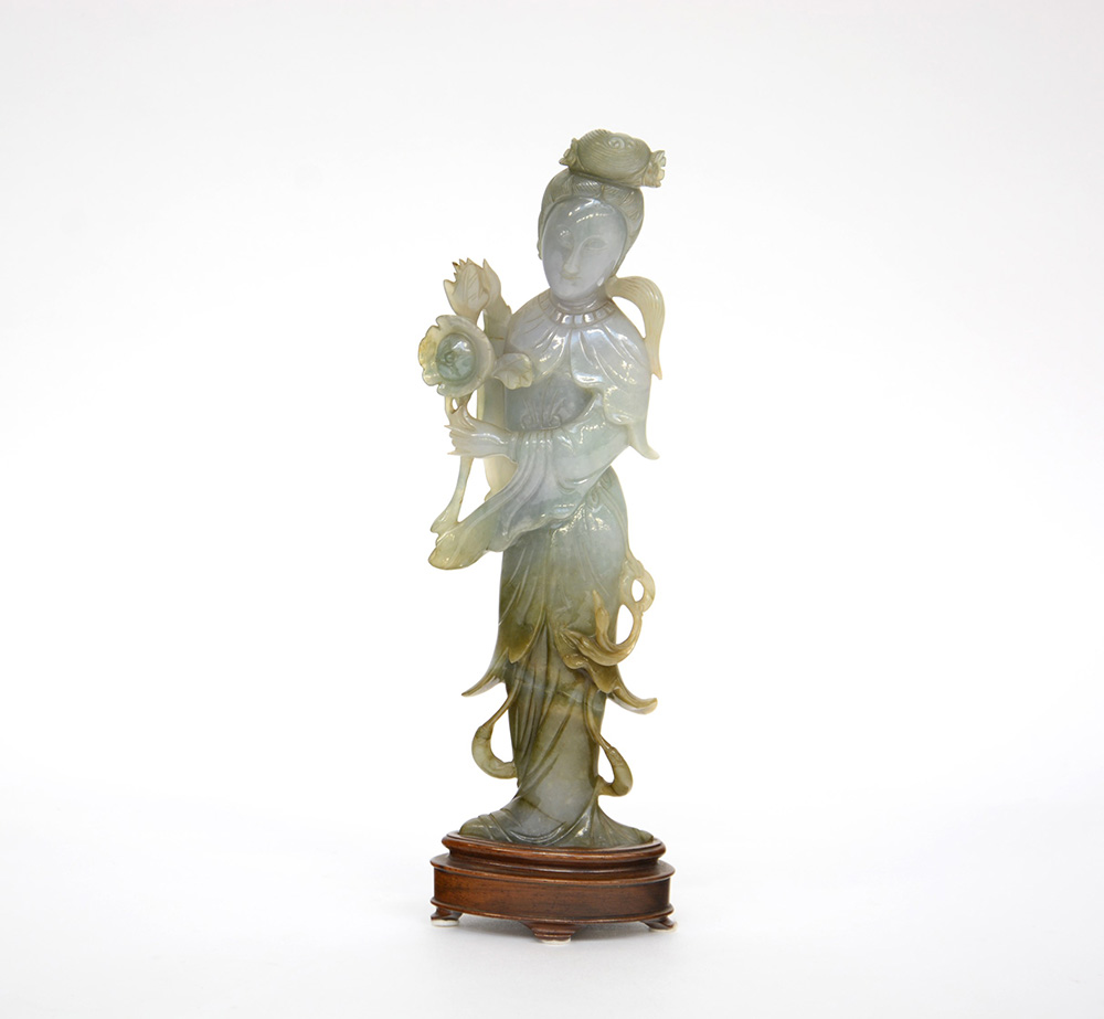 Figura femminile con ramo in fiore in giada, base in legno (difetti)