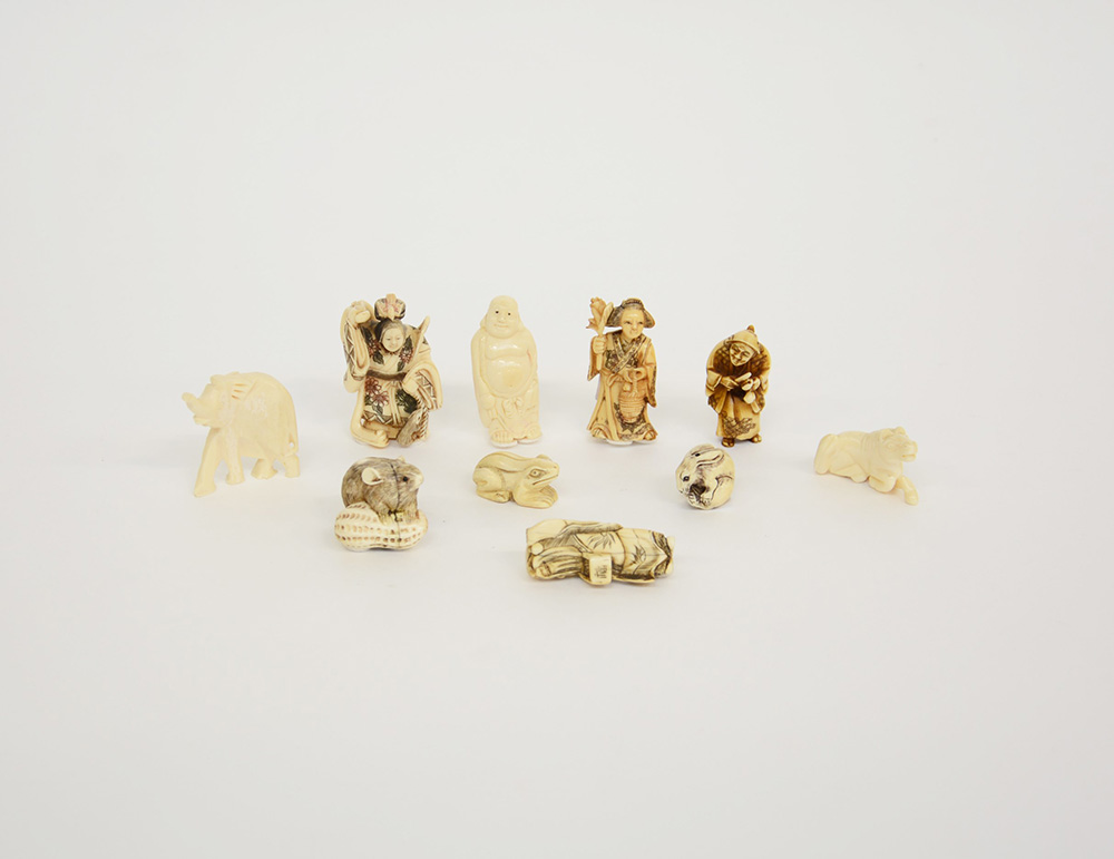 Lotto di nove netsuke e un elefantino in avorio, alcuni firmati. Misure diverse