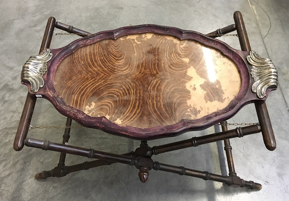 Lotto composto da una base reggi vassoio ed un vassoio ovale in legno con prese in lamina d'argento (difetti)