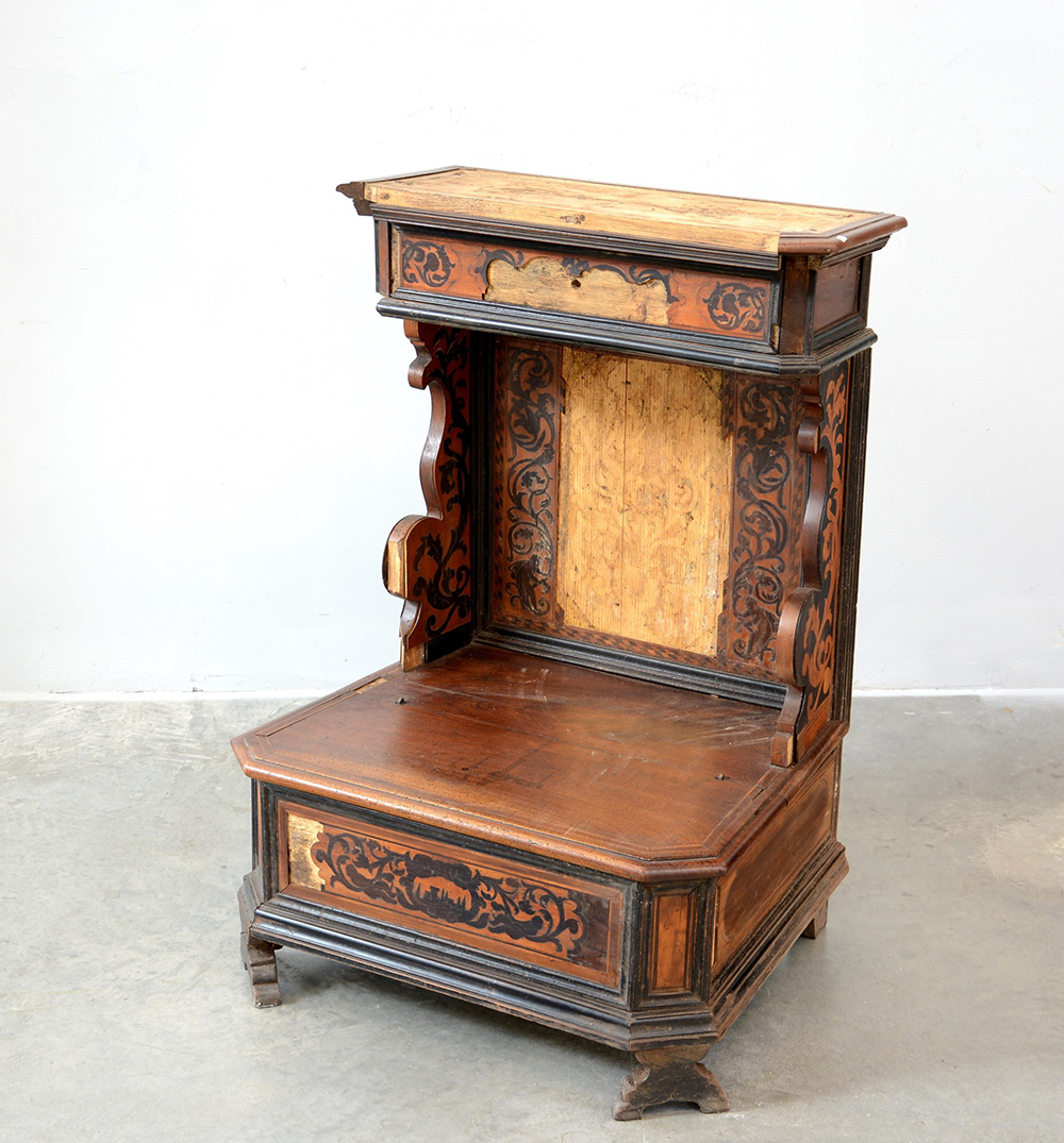 Antico inginocchiatoio decorato a motivi floreali a un cassetto sottopiano,...