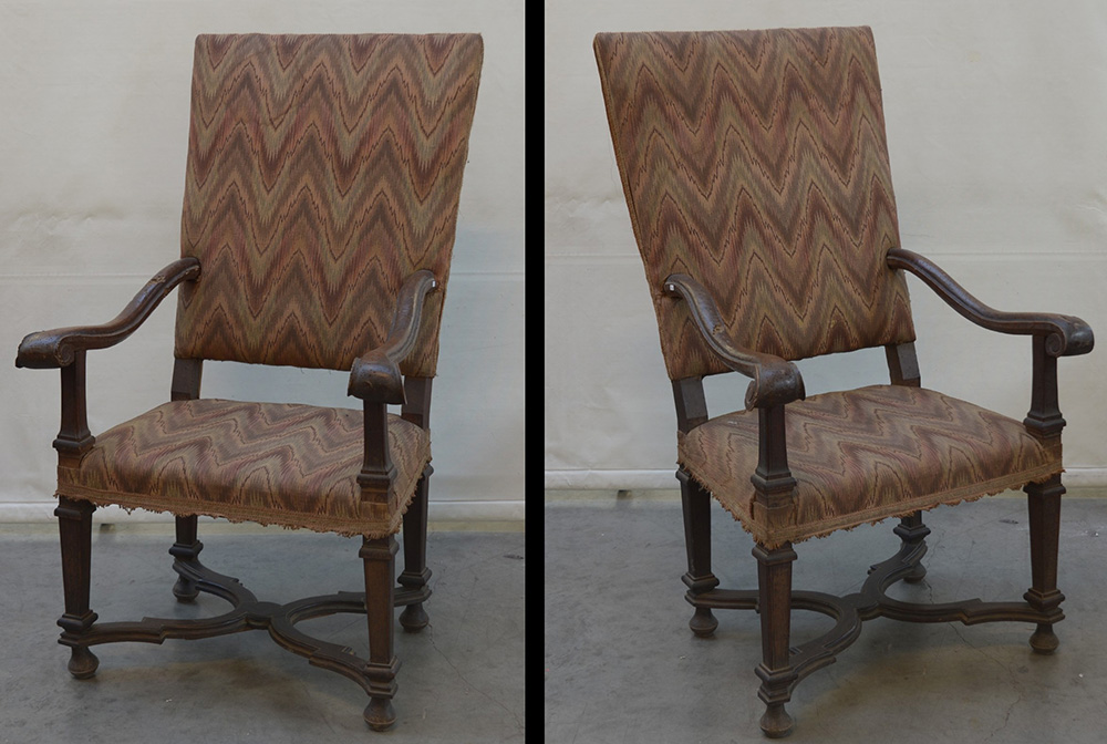 Lotto 3675 | Coppia di poltrone in noce con braccioli mossi terminanti a ricciolo, gambe...