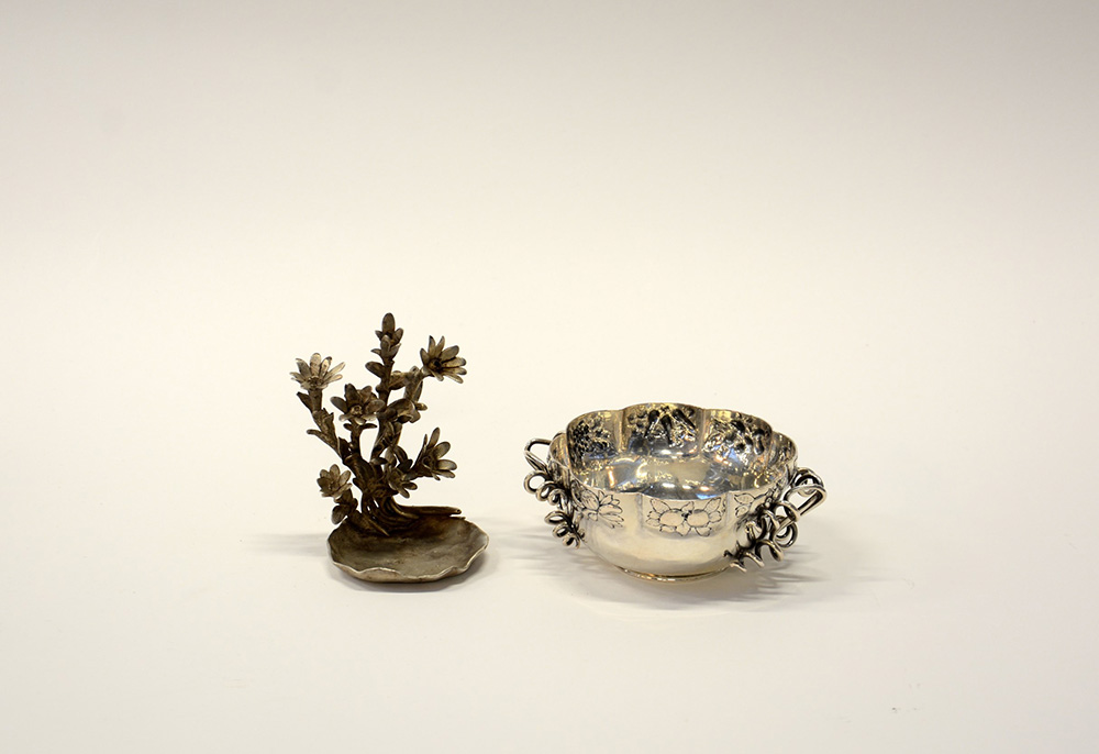 Lotto in argento composto da una ciotola di forma circolare con bordo baccellato e sbalzato a frutti, prese a forma di viticcio. Italia, sec. XX (l. max cm 13 ca.) (g 155 ca.) e un oggetto decorativo modellato in forma di fiori. Italia, sec. XX, firmato Cantani (h cm 10,5 ca.) (gr 195 ca.) (lievi difetti)