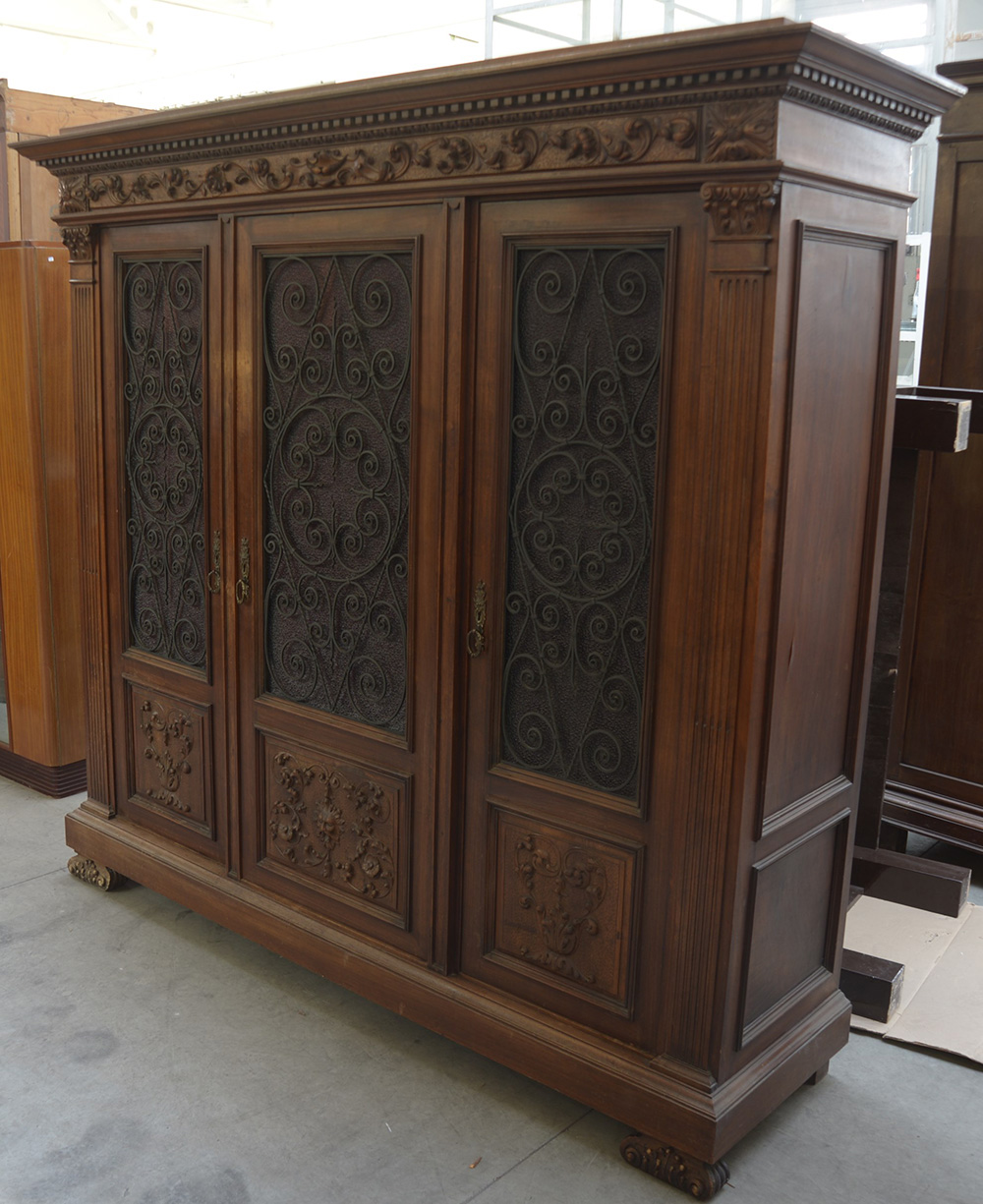 Armadio in legno intagliato a motivi rinascimentali, tre ante a vetri decorati da grate in fero battuto (cm 210x188x58)(difetti)
