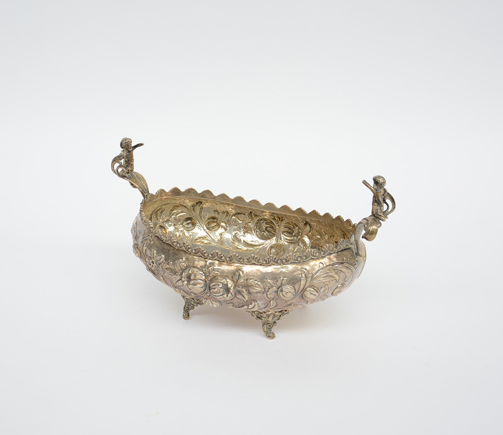 Centrotavola in argento con fascia sbalzata a fiori e volute, anse mosse con amorini, (gr 365 ca.) (l cm 24)