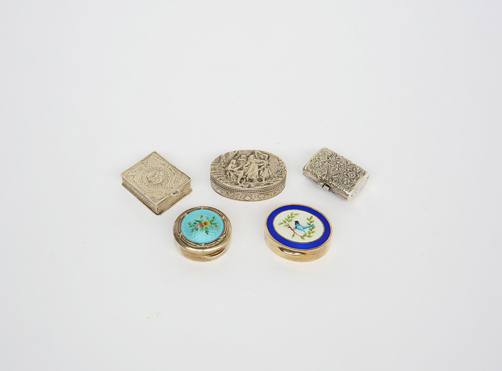Gruppo di cinque scatoline in argento di cui due con coperchi a decoro guilloche e smalti policromi (gr lordi 210 ca.)