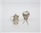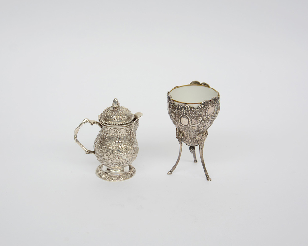 Lotto composto da un portacaviale in argento sbalzato decorato con amorini e coppa in porcellana e una lattiera in argento sbalzato con decoro a volute, gr 190 (h max cm 11)