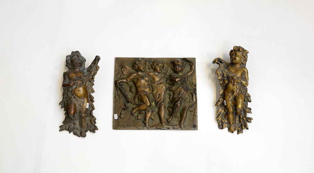 Lotto composto da tre elementi decorativi in bronzo, una placca e due fregi raffiguranti putti con fiori e putti danzanti, misure differenti (lievi difetti)
