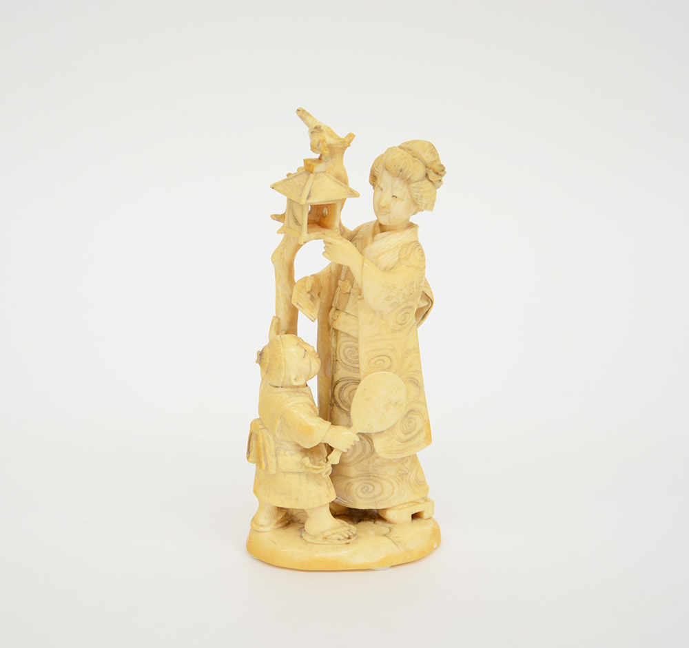 Okimono in avorio raffigurante una figura femminile con bambino che pone un uccellino nella gabbia, firma sul fondo in cartiglio rosso (difetti)