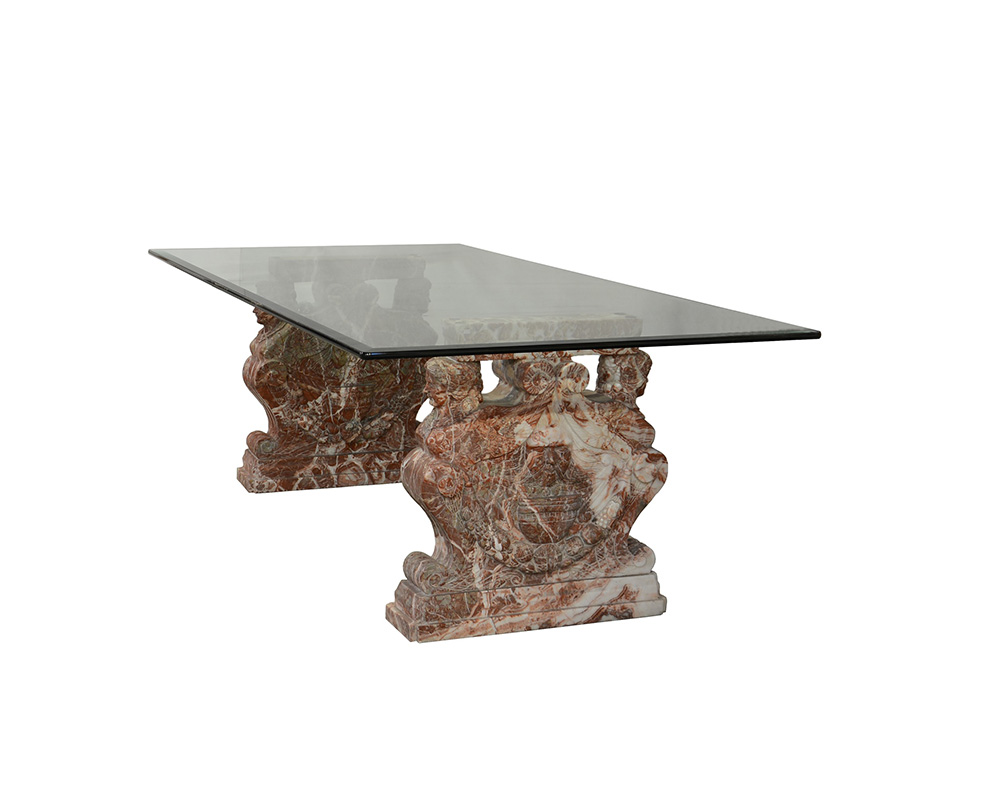 Tavolo composto da una coppia di basi in marmo modellate come sfingi contrapposte e piano in cristallo (cm 200x120) (difetti)